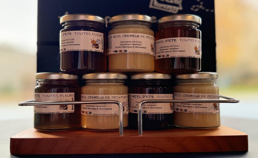Encore en en état liquide, avant de cristalliser ou d'être transformé en miel crémeux, les derniers lots sont disponibles en plusieurs contenants: 125g, 250g, 500g, 1kg